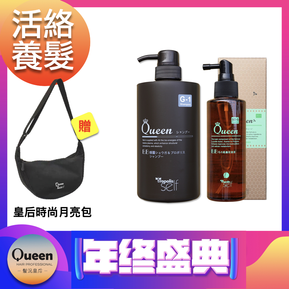 髮況皇后 年終盛典 頭皮養髮保養組-頭皮養護清潔露750ml*1+蜂膠液根源能量精華120ml*1贈 皇后月亮包(顏色隨機)*1