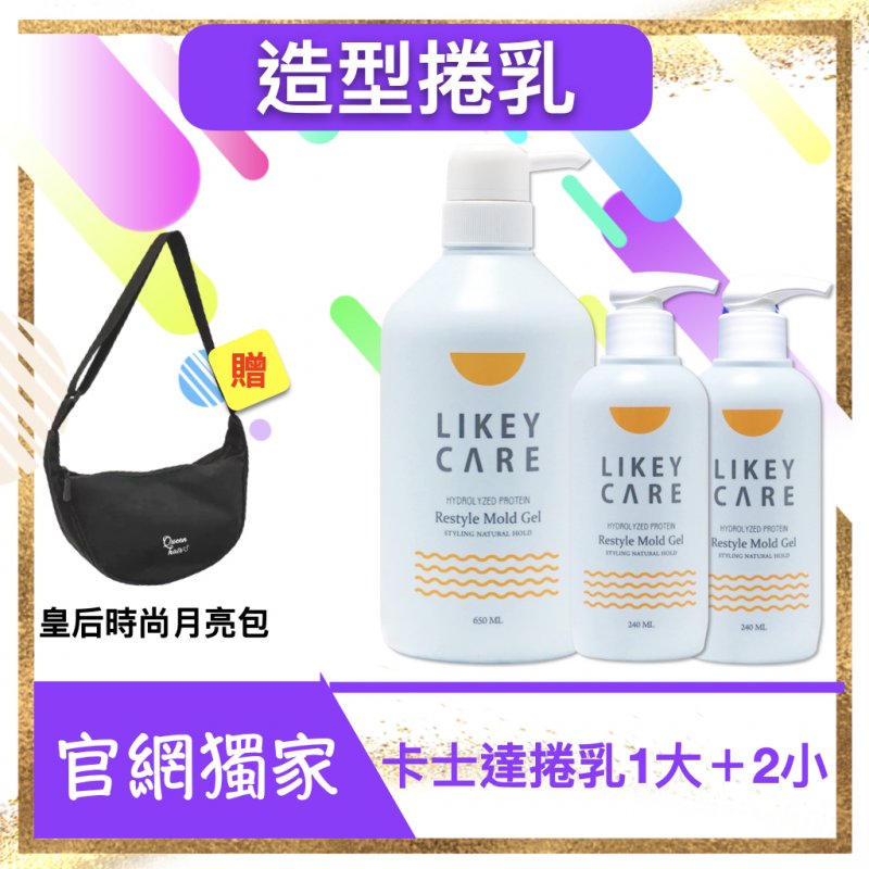 髮況皇后 官網獨家 艾卡爾造型捲乳大+2小-水蛋白卡士達固捲乳650ml*1+水蛋白卡士達固捲乳240ml*2 贈 皇后月亮包(顏色隨機送)*1